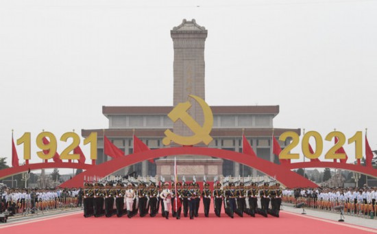 2021年7月1日上午,慶祝中國共產黨成立100周年大會在北京天安門廣場隆重舉行。這是國旗護衛隊準備升旗。新華社記者 申宏 攝