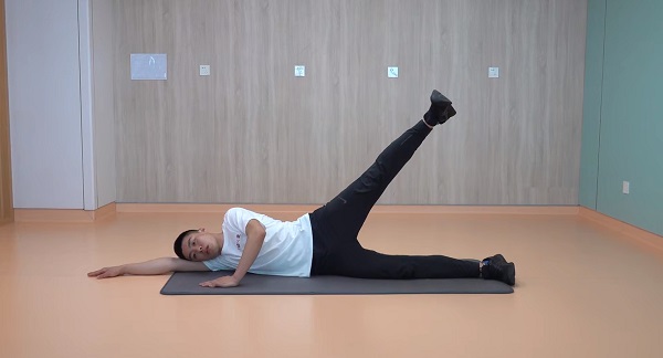 2、側臥抬腿:側臥位,雙腿伸直,上側腿緩慢向上抬起,感受大腿外側發力,保持上身穩定。一組進行10-12次為一組,交換對側重復,每側重復2-3組,組間休息60秒。肌力較好者,可使用彈力帶或沙袋增加負重。